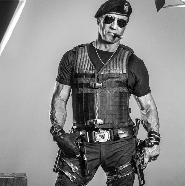 Ross (Sylvester Stallone) carries a Single Action Army (45 Long Colt cartridge) revolver with a speed hammer, shortened barrel, ported with compensator cuts for low recoil and no front sight- in a small of the back holster located in the 3 o'clock position. See and order this gun here:Uberti Sylvester Stallone Limited Edition 45 Colt